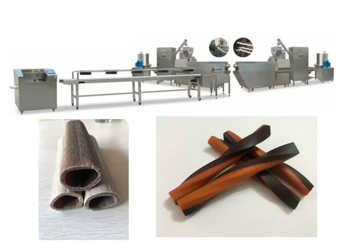 La máquina para fabricar snacks para perros de doble color/alimentos masticables para mascotas retorcidos utiliza almidón como materia prima con una configuración científica y se extruye de una máquina coextrusora, se puede convertir en muchos tipos de formas, como palitos, huesos, etc. Este tipo de alimento para perros no solo proporciona proteínas, grasas y vitaminas para los perros, sino que también satisface el hobby natural del perro. Tiene las siguientes características: fortalece los dientes, limpia la boca y los dientes, los productos pueden tener muchas formas, como retorcidos, bicolor, con relleno de núcleo, etc.