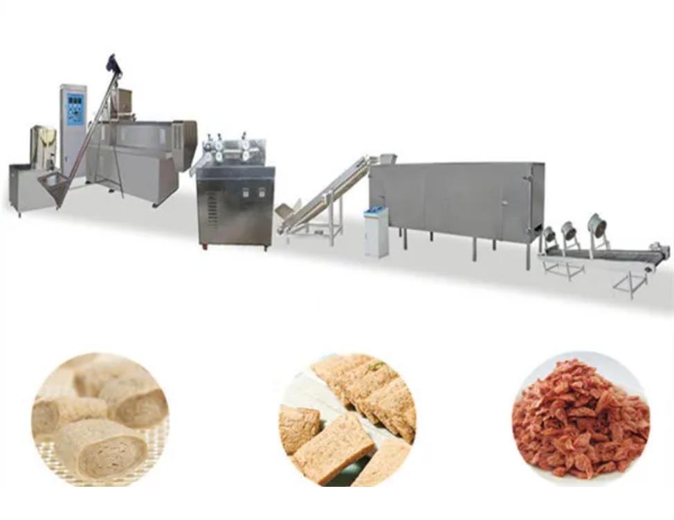 Esta línea toma la comida de soja desengrasada y la comida del cacahuete como materias primas. Después de mezclar, sacando, cortando y secándose, la comida se convierte en textura de la fibra de la capa. Los productos finales tienen de alto valor proteico; parezca y pruebe la carne; fácil al aceite, al agua y al sabor absorbentes; sin la grasa del colesterol y animal, así que es ampliamente utilizada en industria de los productos de carne, producción alimentaria rápida, producción alimentaria ultracongelada, y toda clase de bocados y de comida vegetarianos.